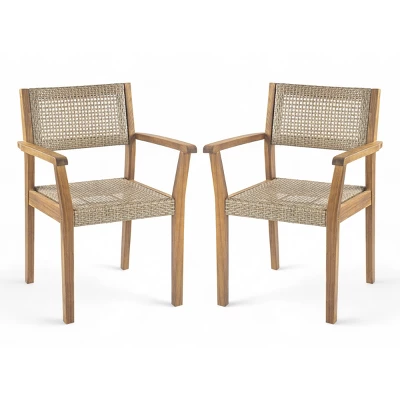 Bring natural elegance and lasting comfort to your outdoor space with this set of two Amaris outdoor dining chairs from Coolbibila. Expertly crafted from solid acacia wood, each chair showcases unique wood grain patterns and warm teak tones that enhance any patio, garden, or balcony. The handwoven wicker backrest adds a touch of texture and breathability, blending timeless charm with modern outdoor design. Built to withstand the elements, these chairs offer weather-resistant durability without sacrificing style. Whether you’re hosting a weekend brunch or enjoying a quiet evening outdoors, the ergonomic design provides reliable support and comfort. Assembly is simple with all tools and instructions included, making it easy to create a refined and inviting outdoor dining experience that’s built to last.