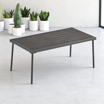 The slatted plastic-wood tabletop mimics natural wood grain while offering superior weather resistance and low maintenance.