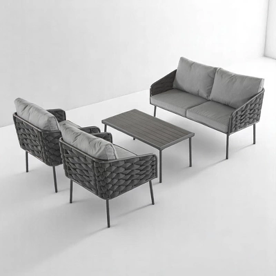 Featuring a loveseat, two rope-woven armchairs, and a coffee table with a plastic-wood tabletop, this set is ideal for patios, gardens, balconies, or poolside areas.