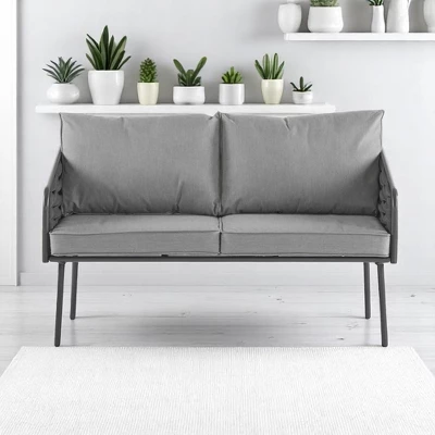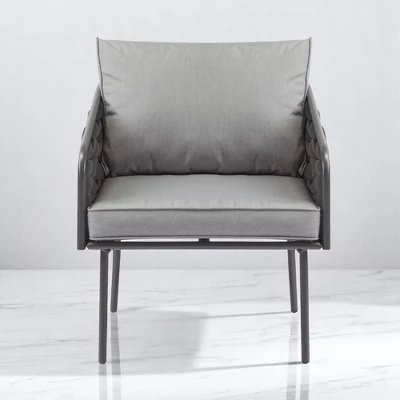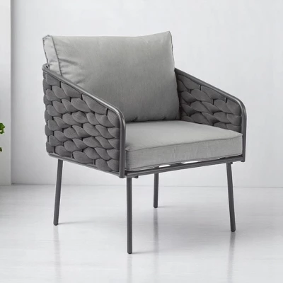 Armchairs and loveseat are accented with wide Teslin rope weaving, offering a unique design element while delivering ergonomic support.