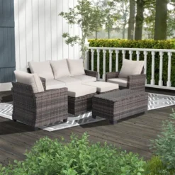 The set includes one loveseat, two armchairs, and one coffee table, making it perfect for creating a cozy and stylish outdoor lounge.