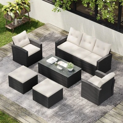 Step into a world of contemporary comfort with our Wicker Sofa Set, a perfect blend of style and functionality for your outdoor space. This set offers a trendy hideaway for relaxation by the pool, in the garden, or on your patio, allowing you to embrace leisure time with friends and family in a chic setting.Versatility is key with this wicker sofa set, accommodating up to 7 people and allowing for various layout configurations to suit different occasions and spaces. Whether on the patio, deck, yard, garden, or even indoors, this set promises to elevate your living area with its adaptable design.Crafted for durability, the set boasts manually treated all-weather PE rattan wicker and a rust-resistant galvanized steel frame, ensuring longevity and stability. The strong steel frame provides support, guaranteeing balance for a secure seating experience.Cleaning is a breeze with removable glass and cushion covers, allowing for easy maintenance and upkeep of your outdoor furniture. Embrace the durability, style, and versatility of our Wicker Sofa Set, designed to enhance your outdoor living experience with comfort and sophistication.