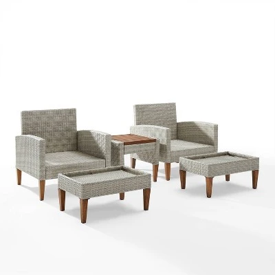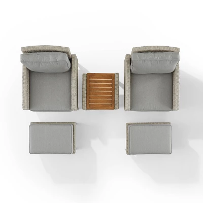 Prop up your feet and chat away with the Capella 5pc Chair Set. Blending cool neutral tones with natural finishes, this set features all-weather resin wicker and hand-painted steel with a natural wood look. Beautiful quick-drying olefin fabric adds durability to the cushioned chairs and ottomans, while the slatted steel top of the side table is the perfect place to set your drink. With its stylish mix of elements, the Capella chair set adds a cool coastal vibe to your porch or patio.