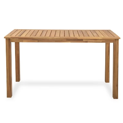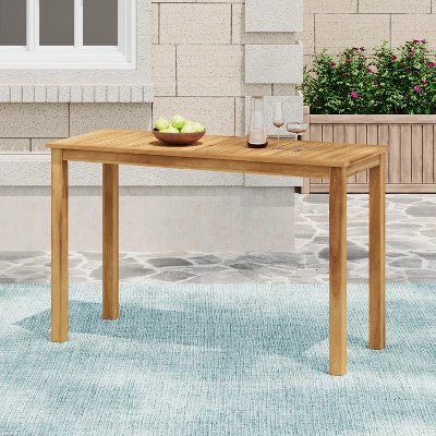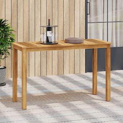Add style and functionality to your outdoor space with this rectangular acacia wood bar table. Designed with a minimalistic silhouette and slatted tabletop, it brings a clean, natural look to any setting. Crafted from weather-resistant acacia wood in a light teak finish, it’s perfect for patios or balconies. Its durable frame resists wear, and assembly is simple with all tools included.