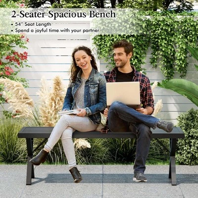 Featuring high-quality metal frame with X-shaped legs, this bench offers sturdy support and long-lasting seat solution. With 54″ seat length, this 2-seater spacious bench allows you to spend a joyful time with your partner. Moreover, the sleek, slatted design and contemporary aesthetics make the loveseat an attractive addition to any setting, from front porches and garden paths to entryways as a shoe bench. This well-designed metal bench will make you enjoy leisurely moments with ease and style.