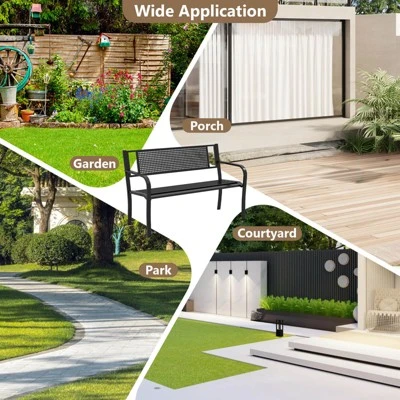 Boasting a robust metal frame with spray-painted finish, this garden bench can ensure long-lasting performance and support up to 660 lbs. The wide and ergonomic seat offers comfortable seating for 2-3 people. Moreover, the patterned backrest and curved armrests add to overall comfort. Suitable for various outdoor environments, this metal loveseat chair is a perfect addition to your garden, patio, porch, etc. Its elegant outlook adds a touch of sophistication to your outdoor space. Additionally, setting up is a breeze thanks to the included instructions and accessories.