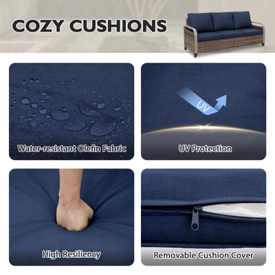 - GATHER, RELAX, ENJOY: This wicker conversation set offers widened seats and plush 5-inch back cushions for maximum comfort. Made with UV-resistant and weatherproof materials, it ensures stylish relaxation