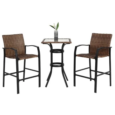 - Blending indoor comfort with outdoor charm, this PE rattan wicker set includes a high table and two chairs, creating the perfect spot for casual dining or leisurely drinks. Its sleek design brings both practicality and elegance to your outdoor space