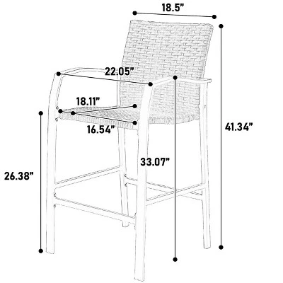 Why Choose Our 3 Pieces Outdoor Bar Stools Set:Square Dining Table with Tempered Glass – This 3-piece wicker patio bistro set features a square high-top bar table with a durable tempered glass top, providing a sturdy surface for drinks, snacks, or decor.Stylish Three-Piece Wicker Bar Set – Blending indoor comfort with outdoor charm, this PE rattan wicker set includes a high table and two chairs, creating the perfect spot for casual dining or leisurely drinks.Modern & Versatile Design – With its simple, modern aesthetic, this outdoor bistro set complements a variety of settings.Stable & Durable Construction – Designed for relaxation, the chairs feature extra-wide seats, ergonomic curved backrests, supportive armrests, and plush cushions.