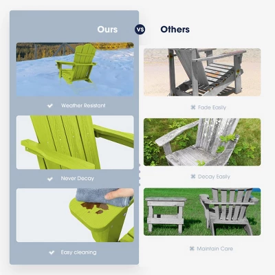 - Durable frame: Enjoy year-round durability. Made with HDPE material, our chair is provided with weather-resistant, water-resistant and UV-resistant, promising seasons of comfort.