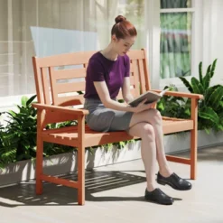 Tangkula Patio Wood Bench Garden Loveseat W/Inclined Backrest Long Armrests Wood Grain