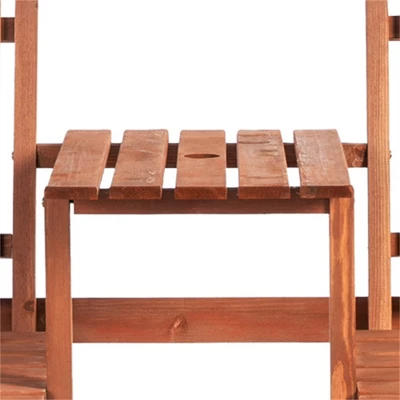 - Outdoor Wood Bench: Enjoy a couple cups of tea while you have a chat with the person sitting next to you. Our wood patio bench has a guest-friendly design with a small chat table between its two seats.