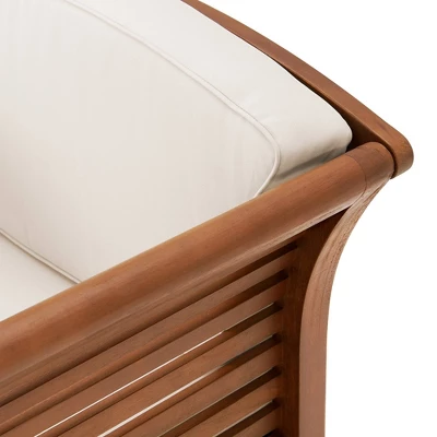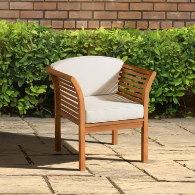Relax on your patio, garden or porch in this eucalyptus outdoor chair with cushions. Open-slat style with elegantly curved armrests, are sure to provide chic style to your outdoor area. Frame is made from durable eucalyptus wood that will stand up to varying weather conditions. The chair includes plush weather-resistant back and seat cushions. This is chair is not only beautiful , but it’s incredibly comfortable, so you can sit outside all day long with a cold, refreshing drink and a good book.
