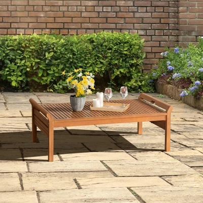 Relax on your patio, garden or porch in this eucalyptus outdoor coffee table. Open-slat style with a natural finish, are sure to provide chic style to your outdoor area. Frame is made from durable eucalyptus wood that will stand up to varying weather conditions. This is table is not only function, but it’s beautiful. Pair this coffee table with other items in the collection for the perfect outdoor entertainment space!