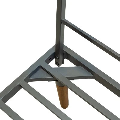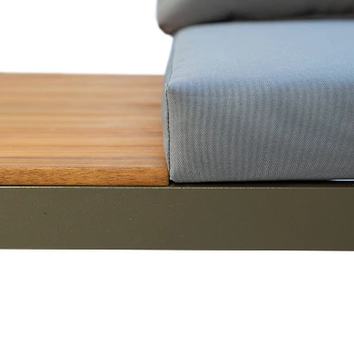 - Gray aluminum frame, sustainable FSC certified wood on armrests and table tops, and polyester cushions.