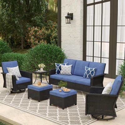Introducing our exquisite 8-piece handwoven wicker patio conversation set ¨C a perfect blend of fashion and durability, taking your outdoor experience to new heights all year round. This set includes 2 swivel chairs, 2 single chairs, a side table, a 3-person sofa and 2 ottomans, making it an ideal choice for sunrooms, gardens, balconies, and poolside areas. Crafted with premium PE wicker, it offers sun protection, waterproofing, rust resistance, and scratch resistance, all while boasting a unique and exotic appearance. The 4-inch thick waterproof seat cushions and plush backrest cushions provide a comfortable seating experience. Easy to assemble with low maintenance costs, this furniture set ensures you won’t have to worry about cracks, splits, or aging. Enhance your outdoor space with our premium handwoven patio conversation set and create a cozy and inviting atmosphere.