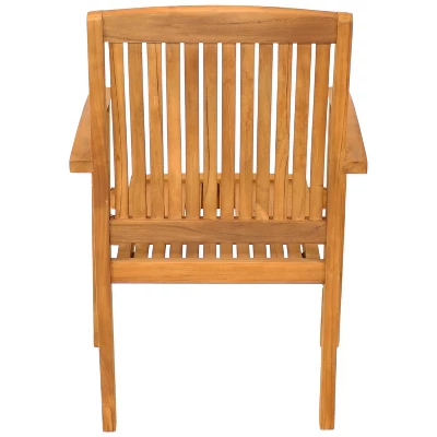 Add extra seating to any outdoor space with these stackable patio chairs with armrests. Pull each chair up to an outdoor dining table or set them on the porch, patio, or deck for additional guest seating. The slat-back and seat design of these chairs and the natural finish add a classic element to any outdoor space. The armrests provide a comfortable place to rest your hands and arms while enjoying some sunshine and conversation with family and friends. These outdoor chairs are made from solid teak wood with a water-based, light brown finish to withstand most weather conditions. To ensure longevity, finish the chairs with a wood oil at the start of each warm season to help preserve the wood’s integrity. Save space in the garage, shed, or storage unit by stacking one chair on top of the other during off seasons. These outdoor teak chairs can hold up to 350 pounds to accommodate most adults.