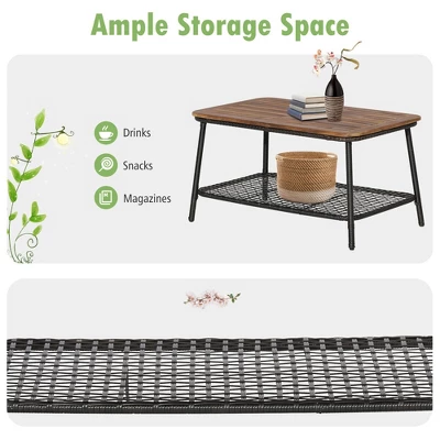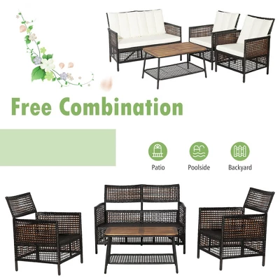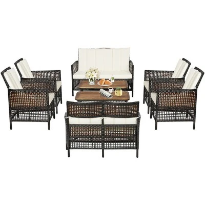 Tangkula 8PCS Cushioned Patio PE Wicker Conversation Furniture Set W/ Acacia Wood Tabletop