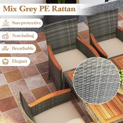 Do you want to chat and drink coffee with your friends or family in the yard during your break? Our rattan outdoor dining furniture includes 1 rectangular dining table and 8 chairs with cushions, providing ample space for family or friends to have dinner. The dining set is made of solid acacia wood and weather-resistant rattan, which can withstand the passage of time and high temperature. In addition to high-quality materials, this patio furniture set has well craftsmanship and excellent load bearing as well. What’s more, the soft and comfortable cushion creates a pleasant chat environment and you won’t be tired because of sedentary. Each chair is equipped with a waterproof cushion with zipper for easy disassembly and cleaning. With practical and modern design, this dining set is exactly what you need to offer a new look for your home.