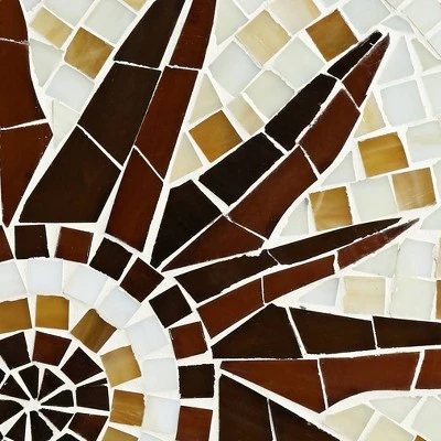 Mosaic patterns show intricate details and incorporate artistic elements and design into this table. This contemporary outdoor accent table has a sunburst patterned mosaic top and a sleek black frame. This table also has a lower shelf to place a plant or any other type of decor accessory.