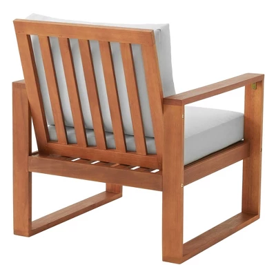 Gather with friends and family to enjoy conversations or meals outside with this stylish wood outdoor chair with gray cushions. Â Its clean lines and simplicity add refinement to any patio setting. Frame is made from durable eucalyptus wood that will stand up to varying weather conditions, and the generously padded all-weather cushions will provide luxurious comfort all day long. The neutral wood finish and gray colored cushions will easily match with any accent pieces in your outdoor space, or pair this beautiful outdoor chair with other items in the collection for the perfect outdoor entertainment space!